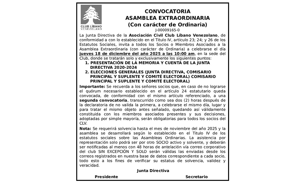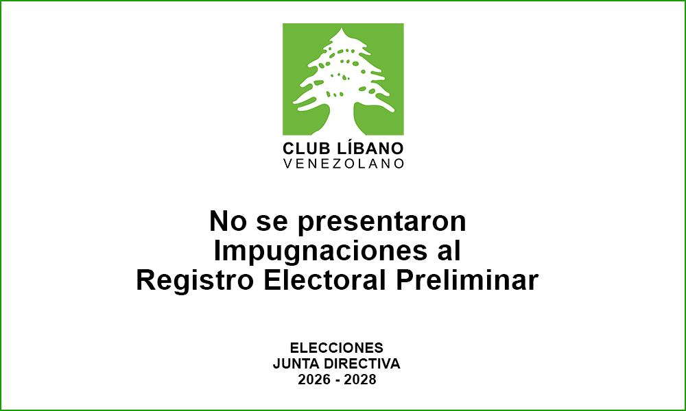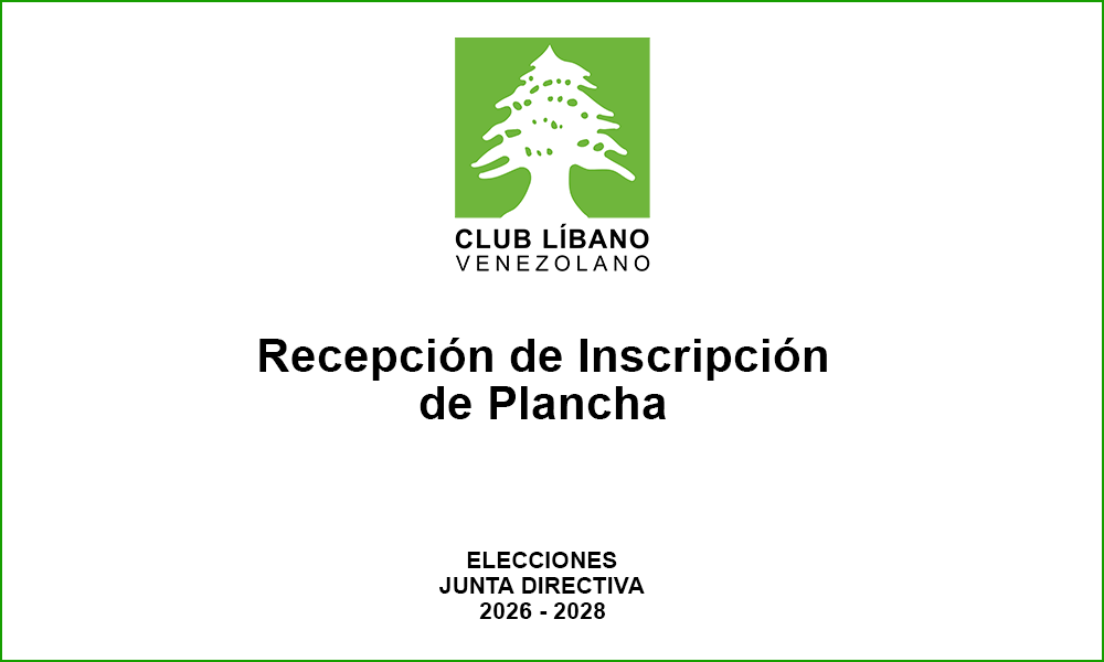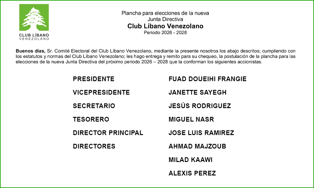 El Comite Electoral del Club Líbano Venezolano en ejercicio de sus funciones, publica la plancha con sus integrantes a participar en las próxima elección de Junta Directiva para el periodo 2026 - 2028.