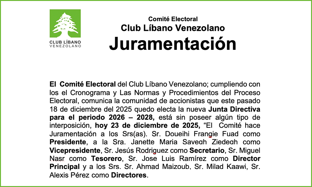 Hoy 23 de diciembre de 2025, “El Comité Electoral” del Club Líbano Venezolano; cumpliendo con los el Cronograma y Las Normas y Procedimientos del Proceso Electoral, hace de conocimento de los Accionistras del Club que: se Juramento a la nueva Junta Directiva, Comisario y Comité Electoral para el periodo 2026 - 2028..